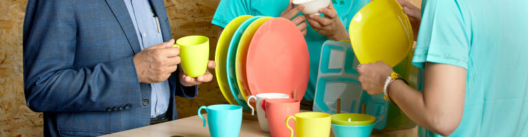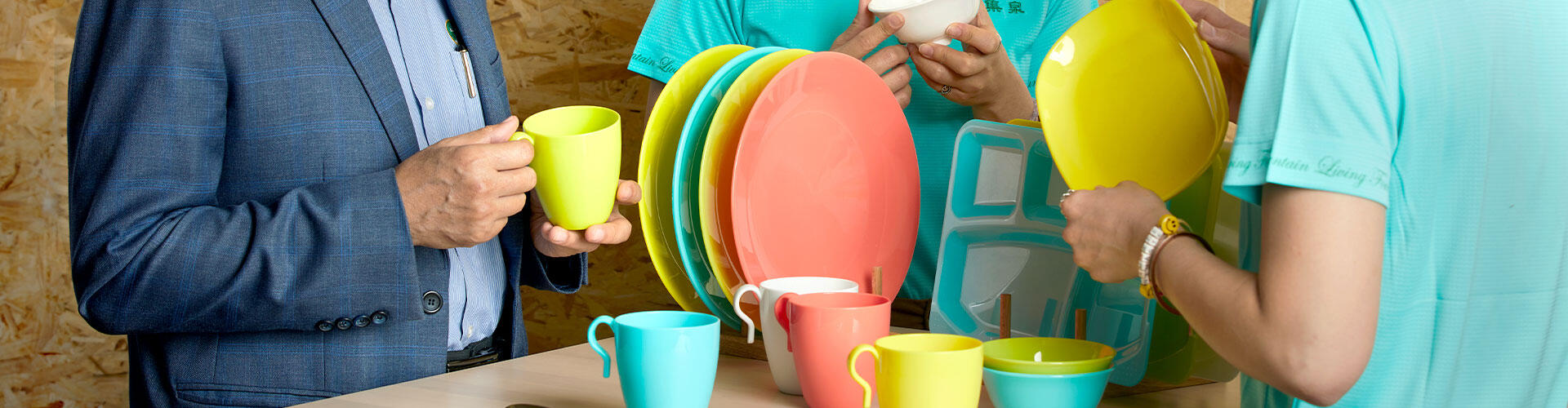 2019年某個熱絡如常的商務洽談中,看著滿桌的茶飲紙杯,向來以「即使是製造業,也希望成為一個工業循環的製造者」來自我期許的 詹景忠董事長,不禁想起與美商營養品牌合作時認識的綠色環保材質Tritan共聚聚酯,「咦,我自己來開發奉茶杯不就好了嗎?客戶喝得安心、還能有效降低環境的衝擊,最後,還能把這個杯子贈送給客戶,讓這份心意與環保精神綿延流長」。